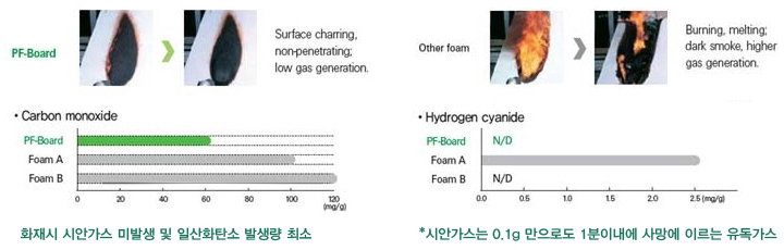 준불연(난연2급) 인증을 받은 PF보드는 화재시 유독가스를거의